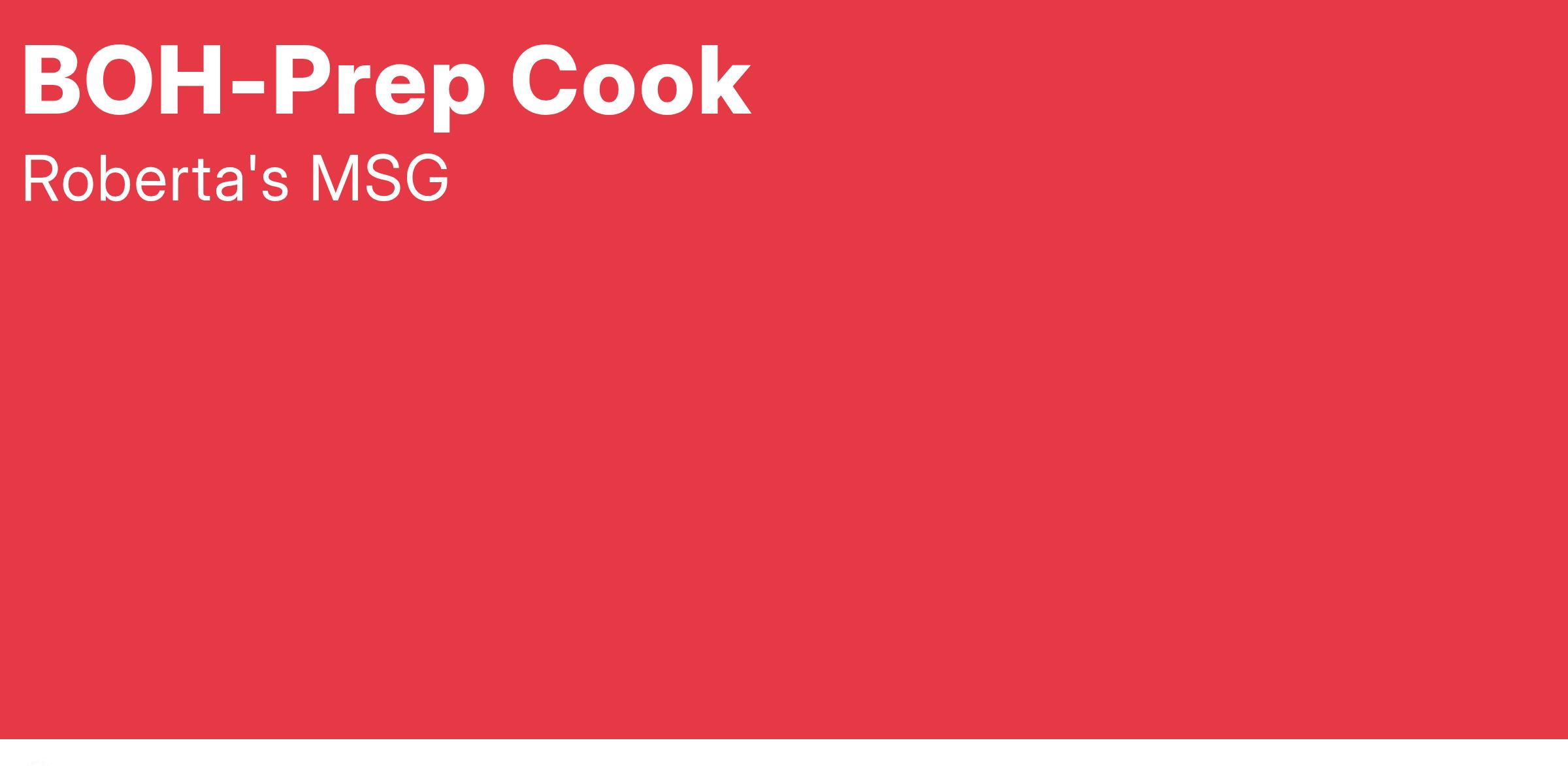 Roberta’s is looking for a prep cook to join our team! Roberta’s which opened in 2008, helped pave the way for the boroughs’ food scene, the pizza game, offering Neapolitan style wood-fired pizzas, artfully crafted cocktails and a diverse natural wine program and quickly became a mecca for pizza and culture. Roberta’s is actively expanding and is looking for talented people to join the family and grow with us!