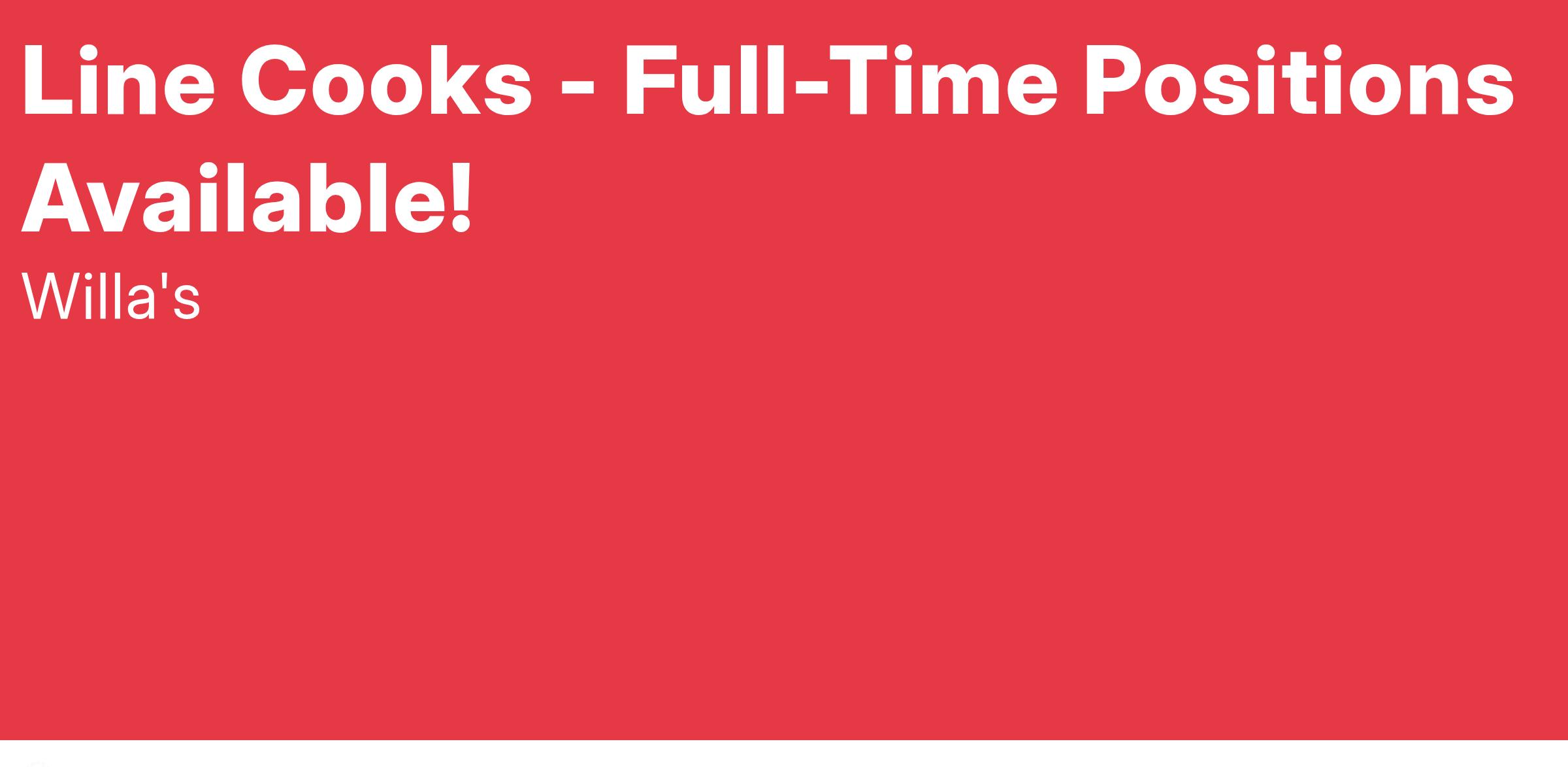 Willa's is seeking a full-time line cook to work join our team. Willa's is an award-winning and lively all-day neighborhood restaurant and bar with amazing service, fun vibes and a team constantly striving for excellence.